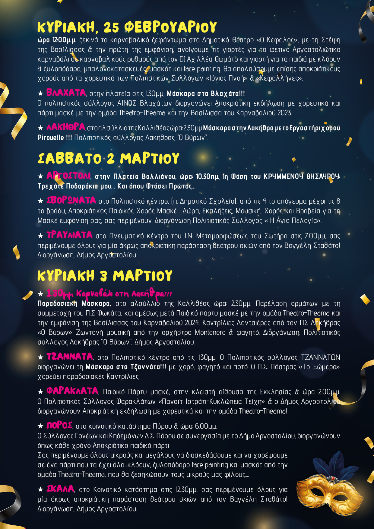 Με την έναρξη και την μεγάλη συμμετοχή στο Παιχνίδι του Κρυμμένου Θησαυρού, παιδικά πάρτυ, παραστάσεις Καραγκιόζη, Παραδοσιακή Μάσκαρα στην Λακήθρα και στα Τζαννάτα, συνεχίζονται οι εκδηλώσεις για το Αργοστολιώτικο Καρναβάλι.