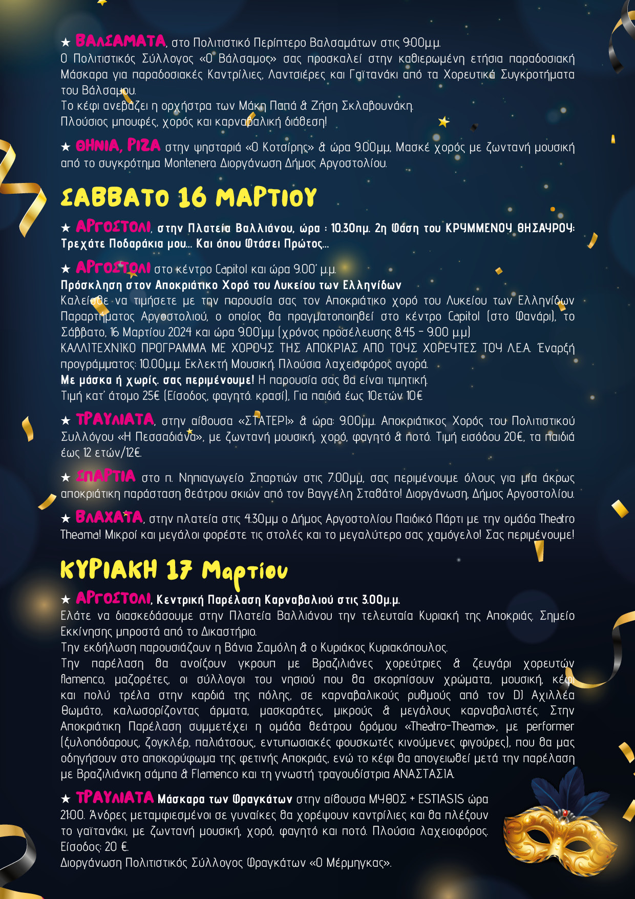 Παραδοσιακή Μάσκαρα, στο αλσύλλιο της Καλλιθέας ώρα: 1.30μμ. Παρέλαση αρμάτων με τη συμμετοχή του Π.Σ Φωκάτα, και αμέσως μετά Παιδικό πάρτυ μασκέ με την ομάδα Theatro-Theama και την εμφάνιση της Βασίλισσας του Καρναβαλιού 2024. Καντρίλιες Λαντσιέρες από τον ΠΣ Λακήθρας «Ο Βύρων» Ζωντανή μουσική από την ορχήστρα Montenero & φαγητό. Διοργάνωση, Πολιτιστικός σύλλογος Λακήθρας “Ο Βύρων”, Δήμος Αργοστολίου.