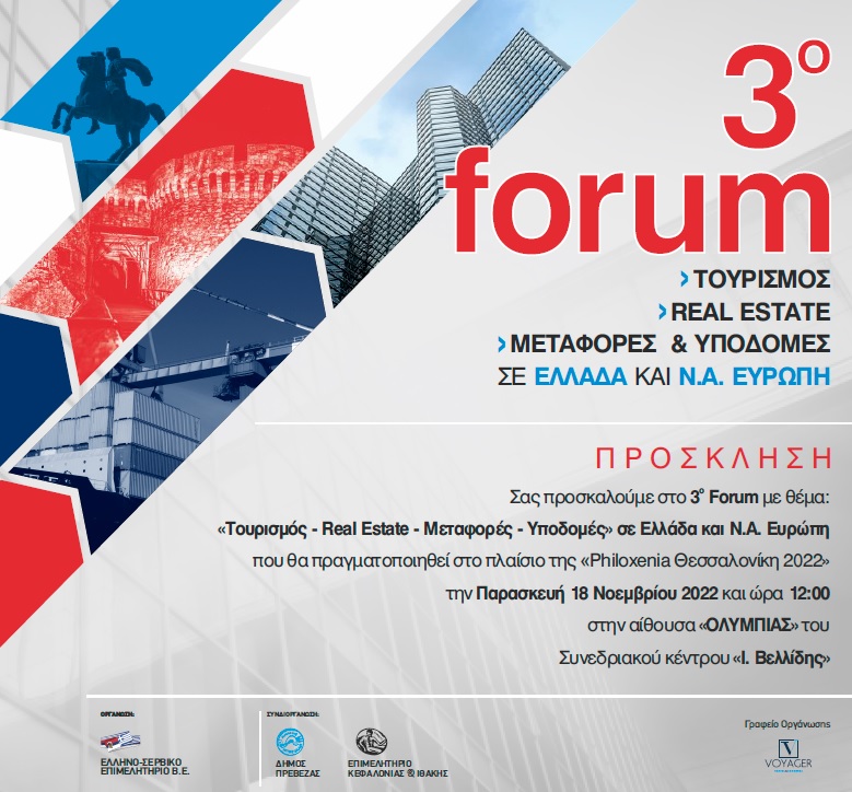 Το Επιμελητήριο Κεφαλληνίας και Ιθάκης, στα πλαίσια και κατά τη διάρκεια της “PHILOXENIA 2022” συνδιοργανώνει με το Ελληνοσερβικό Επιμελητήριο Β. Ελλάδος και με τον Δήμο Πρέβεζας forum με θέμα: