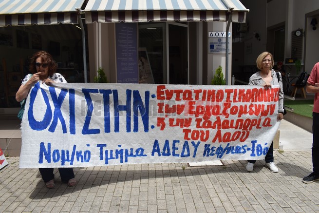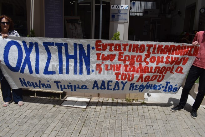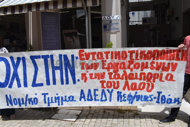 Εδώ στην Κεφαλονιά έξω από την Εφορία μαζεύτηκαν οι εργαζόμενοι από την Εφορία για να διαμαρτυρηθούν . Μίλησε ο Δημ. Μαντζουράτος εκ μέρους του τμήματος Κεφαλονιάς και Ιθάκης της ΑΔΕΔΥ, και ο Πρόεδρος του Εργατικού Κάντρου Σπ. Καμπίτης και άλλοι.