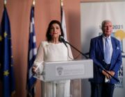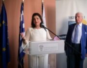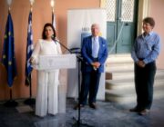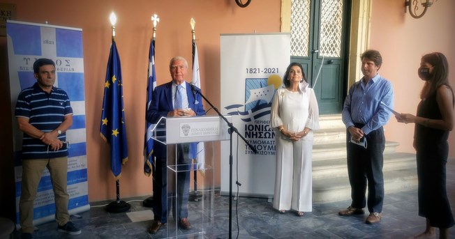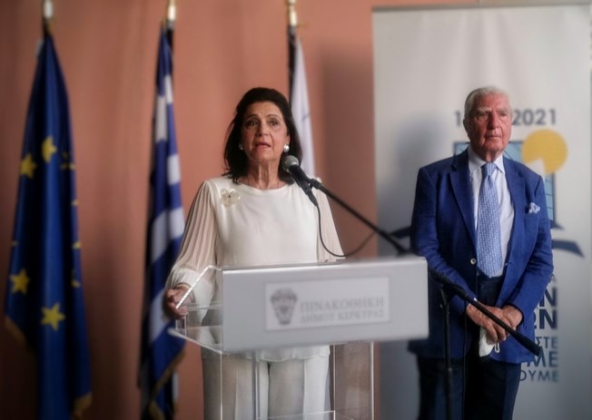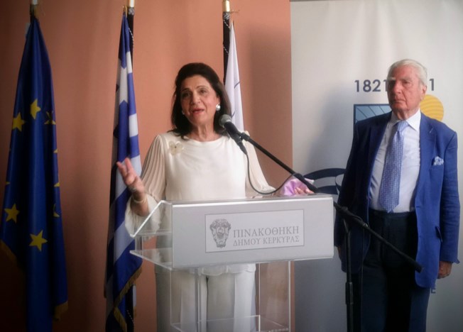 Η Περιφερειάρχης, κατά τον χαιρετισμό της, ευχαρίστησε τον Πρόεδρο του Ιδρύματος Κερκυραϊκής Κληρονομιάς, Σπύρο Φλαμπουριάρη, για τη συνεργασία του με την Περιφέρεια Ιονίων Νήσων σ’ ένα ολοκληρωμένο πρόγραμμα εκδηλώσεων που θ’ ακολουθήσει με διάφορες δραστηριότητες στο θέμα «Ύμνος εις την Ελευθερίαν», όπως και τον Μεγακλή Ρογκάκο για την επιμέλειά του και τον Πρόεδρο του Δ.Σ. της Δημοτικής Πινακοθήκης Κέρκυρας, Σπύρο Μωραΐτη.