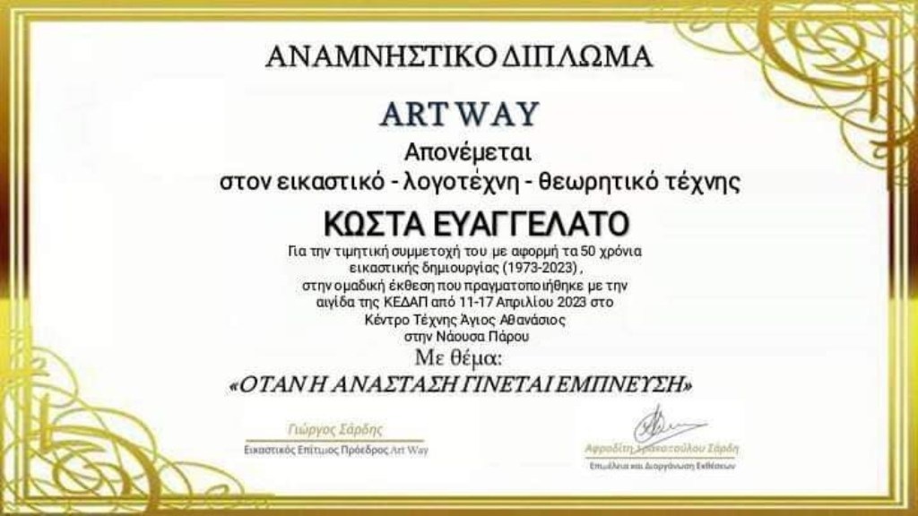 Τις Ημέρες του Πάσχα συμμετείχε με επιτυχία, ως τιμώμενος καλλιτέχνης, με αφορμή τα 50 χρόνια της δημιουργικής του πορείας (1973-2023), στην ομαδική έκθεση της ART WAY με τίτλο «Όταν η Ανάσταση γίνεται έμπνευση» που διοργανώθηκε στο Κέντρο τέχνης “Aγιος Αθανάσιος” στη Νάουσα της Πάρου.