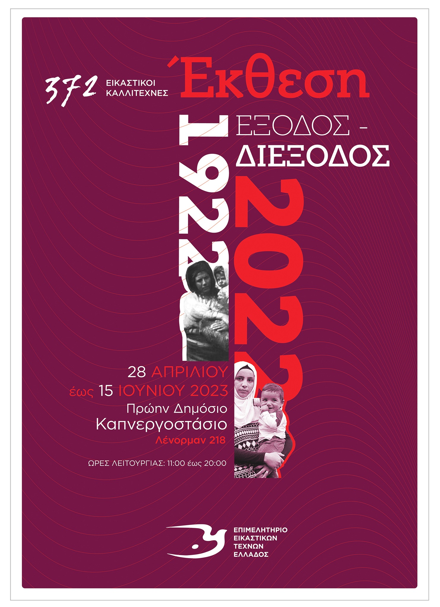 Πρόκειται για την μεγάλη επετειακή έκθεση με τίτλο “1922-2022 ΕΞΟΔΟΣ-ΔΙΕΞΟΔΟΣ” που διοργάνωσε το Επιμελητήριο Εικαστικών Τεχνών Ελλάδας (ΕΕΤΕ) στο κτίριο του πρώην Δημόσιου ΚΑΠΝΕΡΓΟΣΤΑΣΙΟΥ, Λένορμαν 218 στην Αθήνα. Η έκθεση θα διαρκέσει μέχρι τις 15 Ιουνίου 2023.