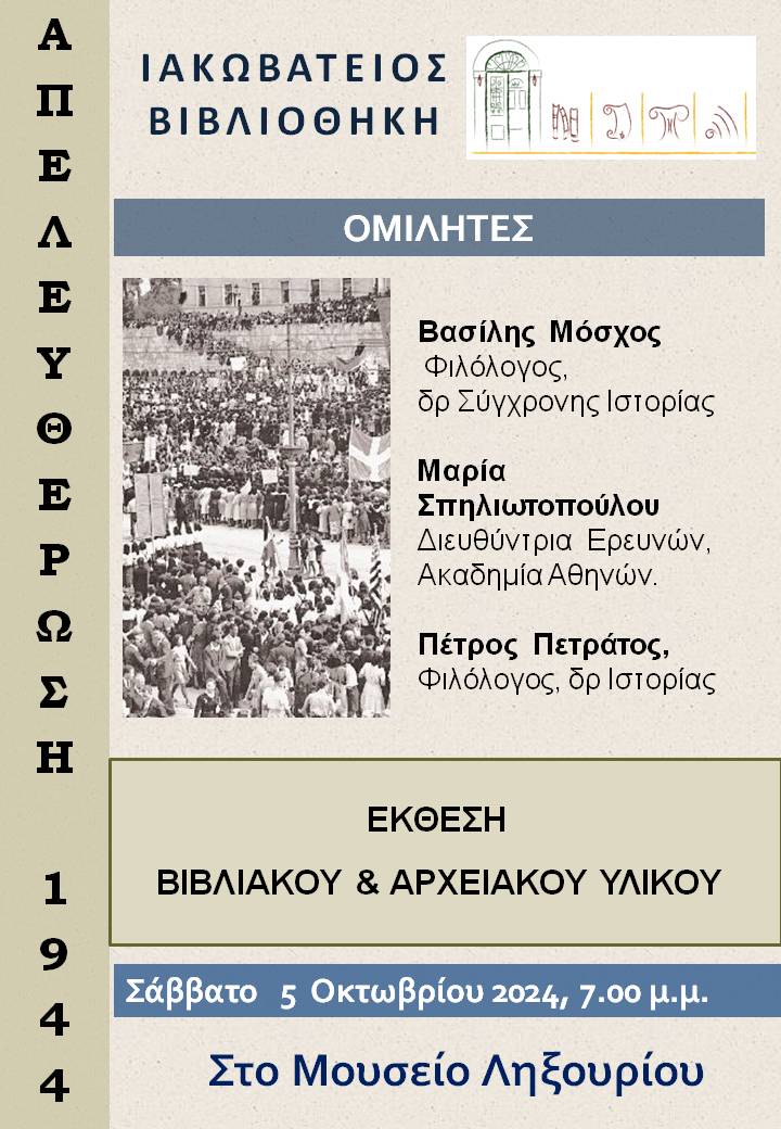 Η Ιακωβάτειος Βιβλιοθήκη, με τη συμπλήρωση 80 χρόνων από την απελευθέρωση της χώρας, όπως και της Κεφαλονιάς, από τους Γερμανούς το 1944, διοργανώνει Εσπερίδα το Σάββατο, 5 Οκτωβρίου 2024, στις 7 μ.μ., στην κεντρική αίθουσα του Μουσείου Ληξουρίου με σχετικές ομιλίες και Έκθεση βιβλιακού και αρχειακού υλικού από τα βιβλία και τα αρχειακά τεκμήρια της Βιβλιοθήκης μας.