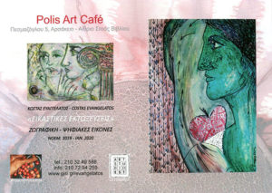 Από το Σάββατο 9 Νοεμβρίου 2019 θα παρουσιάζεται στο POLIS ART CAFE, Πεσμαζόγλου 5 και Πανεπιστημίου, στο Αίθριο της Στοάς του βιβλίου, η έκθεση του ζωγράφου, λογοτέχνη, θεωρητικού τέχνης Κώστα Ευαγγελάτου, με τίτλο “Εικαστικές Εκτοξεύσεις”. Ο καλλιτέχνης κάθε Σάββατο στις 5.30 μ.μ. θα ξεναγεί τους φιλότεχνους.