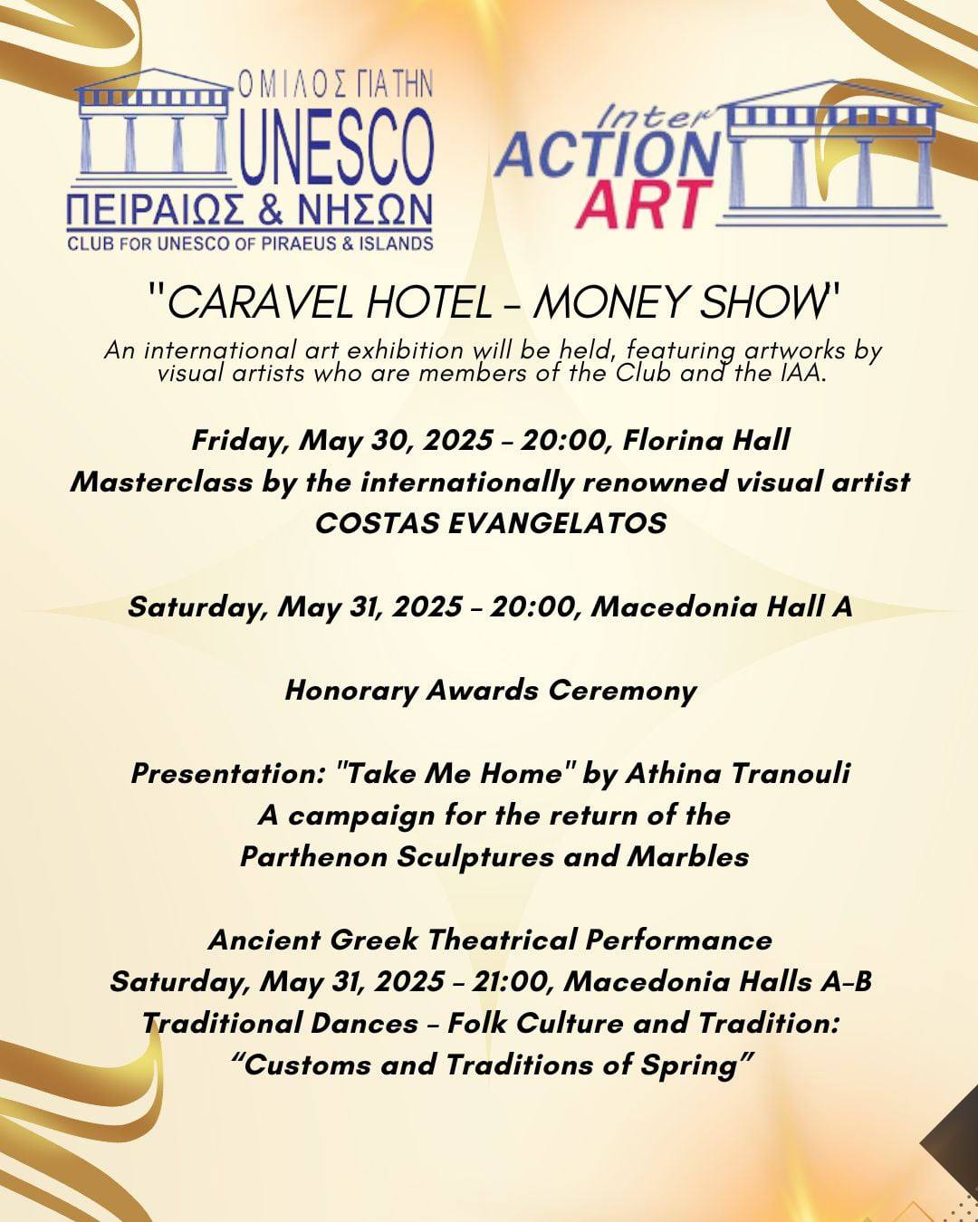 Xαιρετισμό και προλογική παρουσίαση στην έναρξη της εκδήλωσης απηύθυνε ο πρόεδρος της Ευρωπαϊκής και Βορειοαμερικανικής Ομοσπονδίας ομίλων και συλλόγων για την UNESCO, κος Ιωάννης Μαρωνίτης, ο οποίος στη λήξη του masterclass βράβευσε τον διακεκριμένο δημιουργό για την προσφορά του στο πολιτιστικό γίγνεσθαι και την συνεργασία του στην εκπαιδευτική εκδήλωση, που διοργανώθηκε στα πλαίσια του διεθνούς forum Money Show 2025.