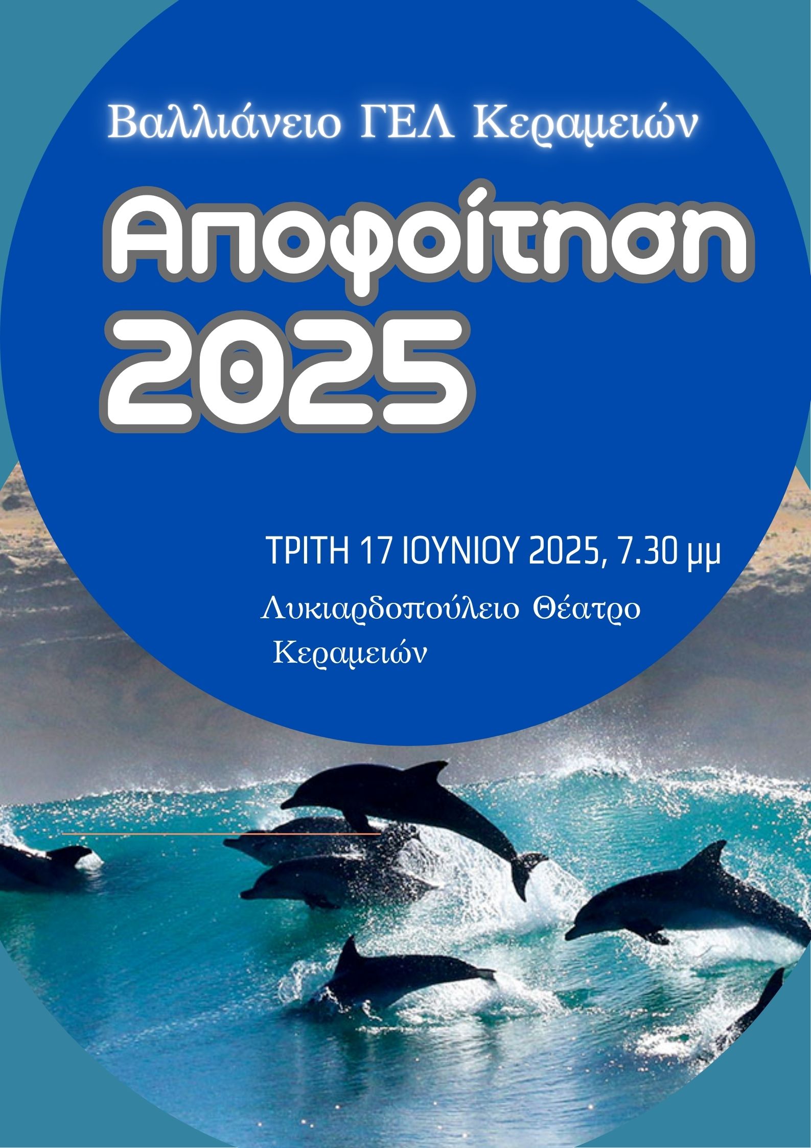 Το Βαλλιάνειο Γενικό Λύκειο Κεραμειών οργανώνει για 12η συνεχόμενη χρονιά την εκδήλωση αποφοίτησης του σχολικού έτους 2024-25 την Τρίτη 17 Ιουνίου 2025 και ώρα 07:30 το απόγευμα στο Λυκιαρδοπούλειο Θέατρο του Σχολικού Συγκροτήματος Κεραμειών.