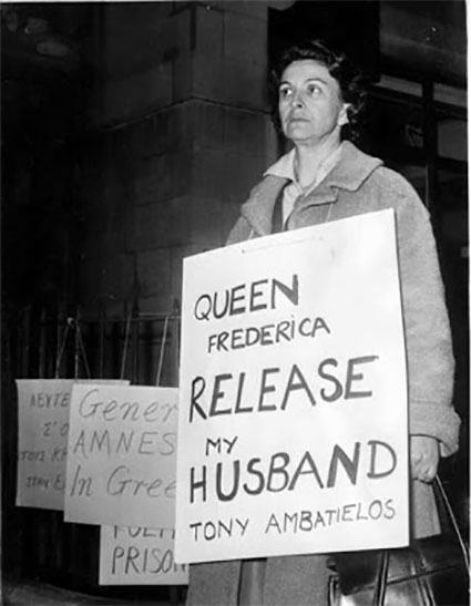 Στην Αγγλία, η Μπέτυ Αμπατιέλου αποδύεται σε αγώνα για την απελευθέρωση των πολιτικών κρατουμένων στην Ελλάδα. Γράφει φυλλάδια, κινητοποιεί βουλευτές της αριστερής πτέρυγας του Εργατικού Κόμματος και παράλληλα εκμεταλλεύεται κάθε ευκαιρία επίσημης επίσκεψης στο Λονδίνο για να θέτει το θέμα όχι μόνο του «Τόνυ» όπως είναι γνωστός στην Αγγλία ο Αντώνης Αμπατιέλος, αλλά και όλων των πολιτικών κρατουμένων.