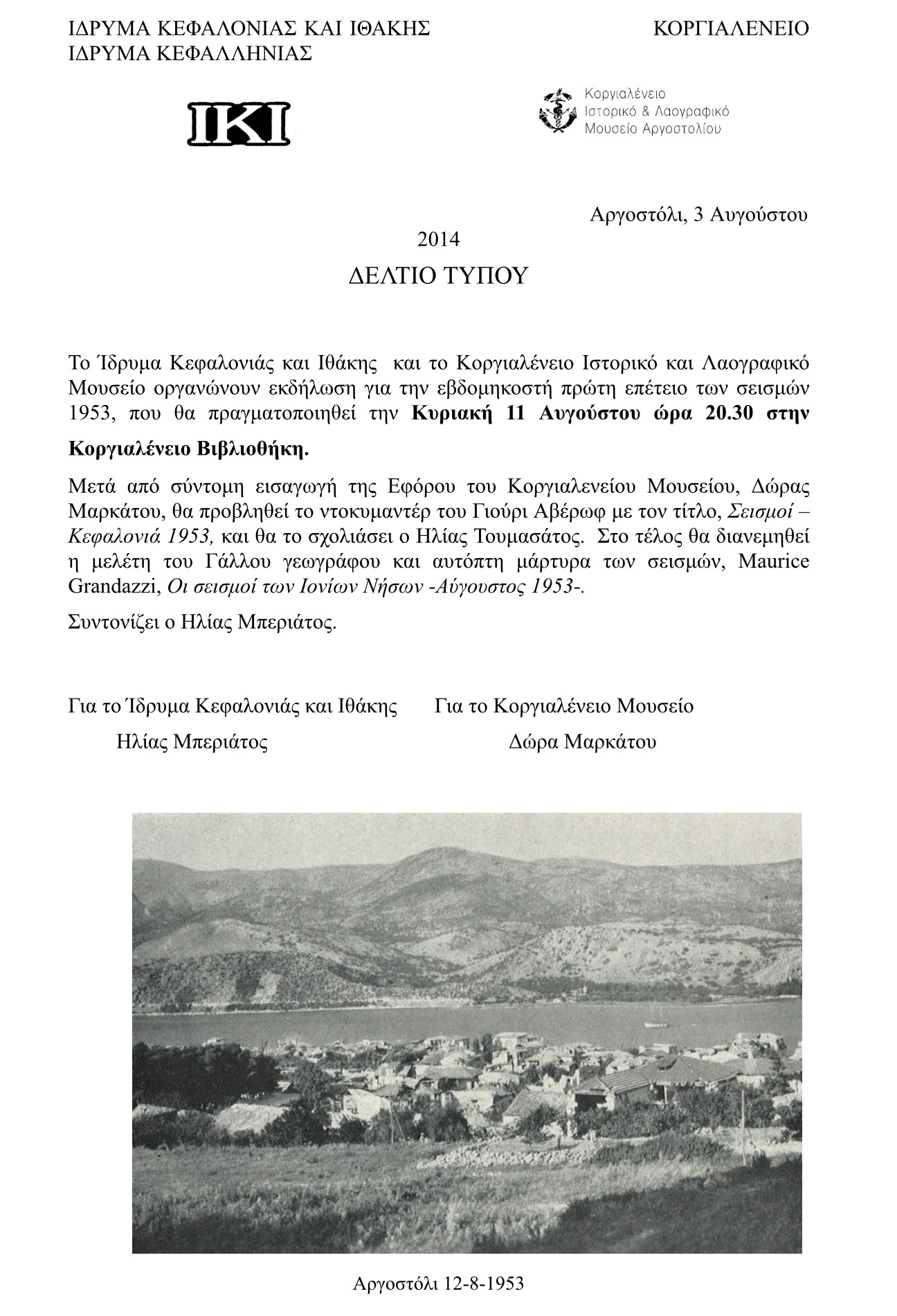 Εκδήλωση για την 71η επέτειο των σεισμών 1953 στην Κοργιαλένειο Βιβλιοθήκη