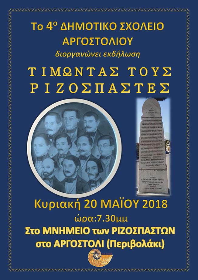 Την Κυριακή 20-5-2018 , και ώρα 7:30 μ.μ. στο μνημείο των Ριζοσπαστών του Αργοστολίου, θα γίνει εκδήλωση του 4ου Δημοτικού Σχολείου Αργοστολίου με θέμα «Τιμώντας τους Ριζοσπάστες» σε συνεργασία με την ΚΕΔΗΚΕ και τον υπεύθυνο σχολικών δραστηριοτήτων της Πρωτοβάθμιας εκπαίδευσης Κεφαλληνίας κ. Γεράσιμο Σ. Γαλανό.