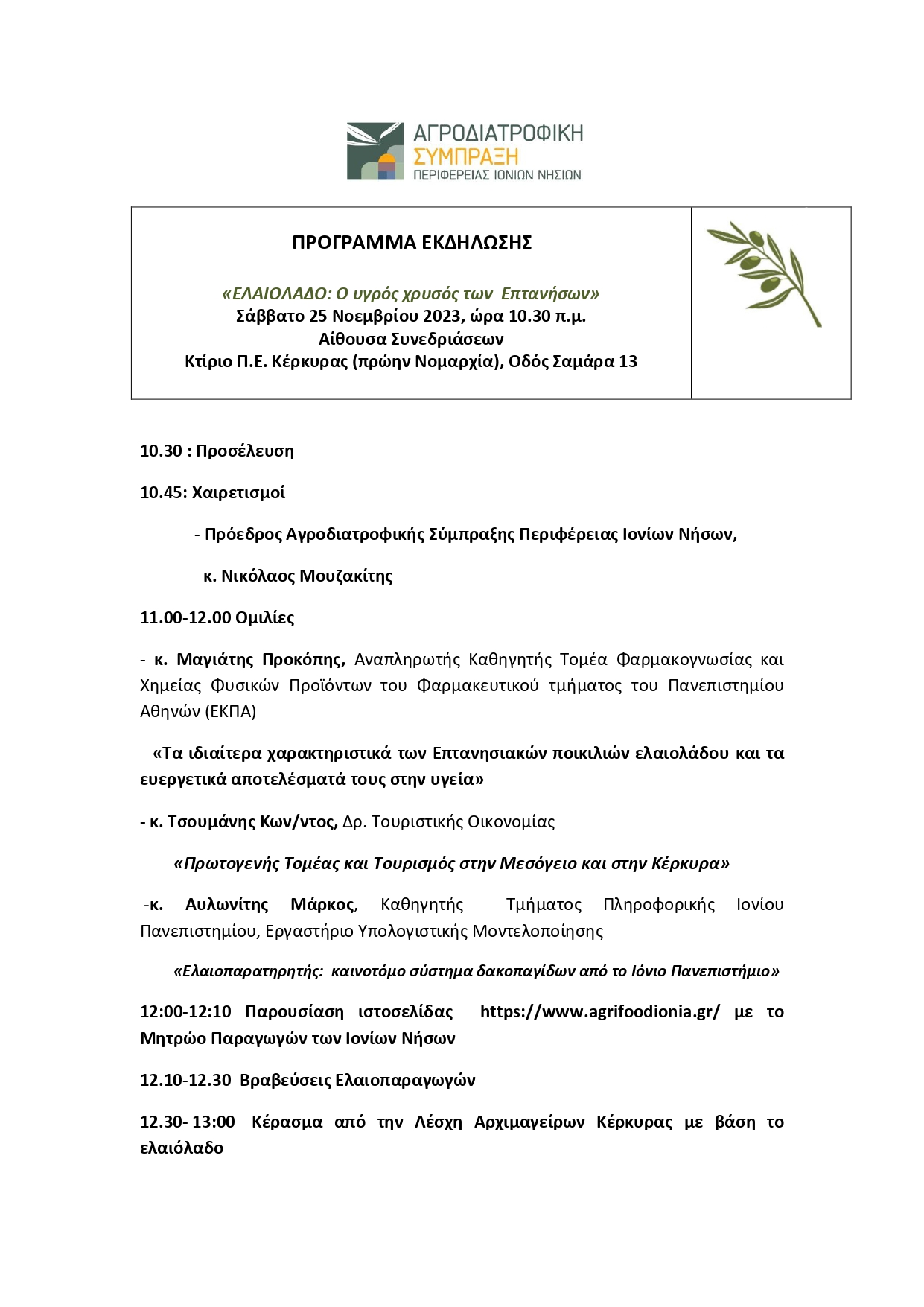 ΕΚΔΗΛΩΣΗ “ΕΛΑΙΟΛΑΔΟ, Ο ΥΓΡΟΣ ΧΡΥΣΟΣ ΤΩΝ ΕΠΤΑΝΗΣΩΝ”