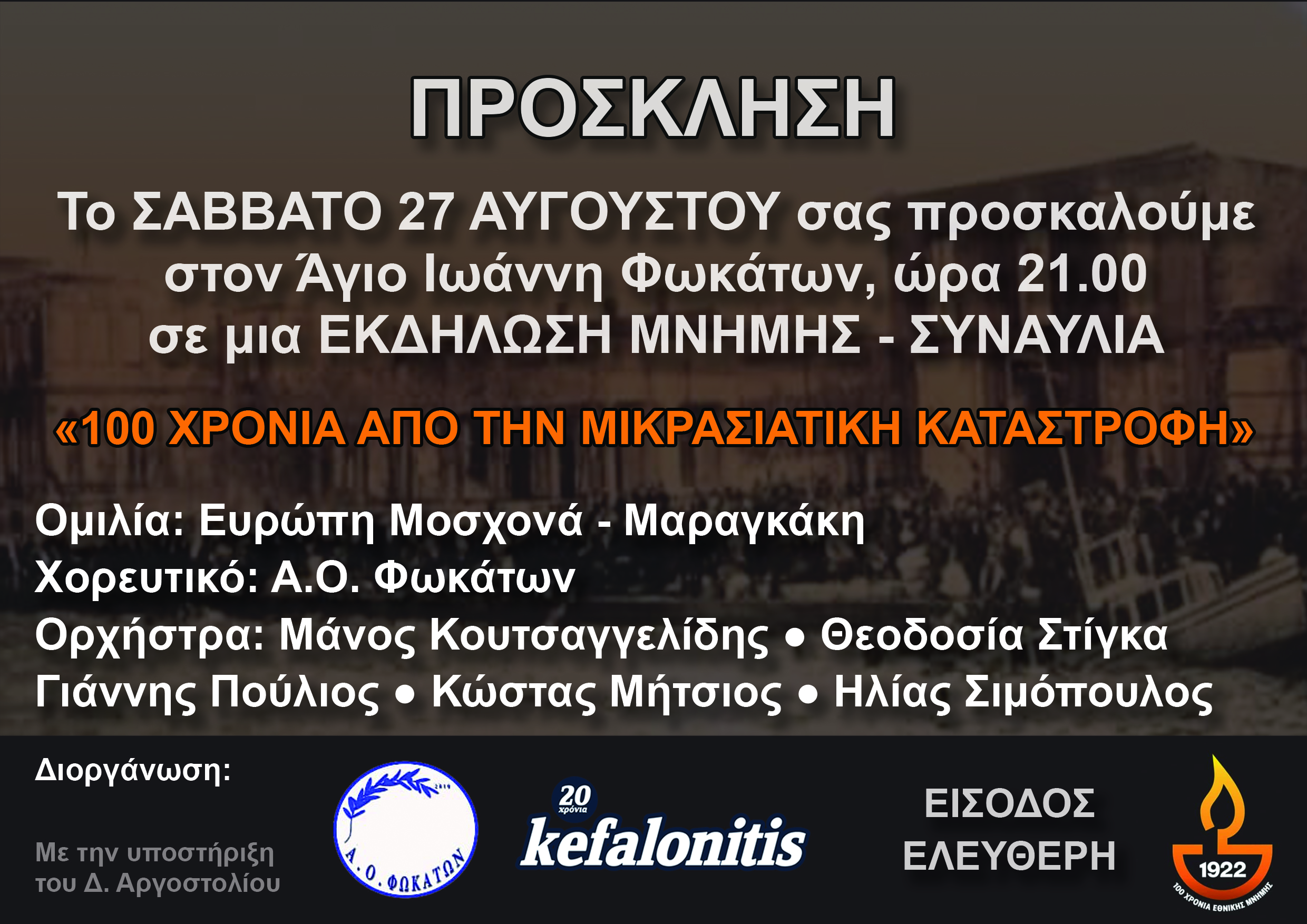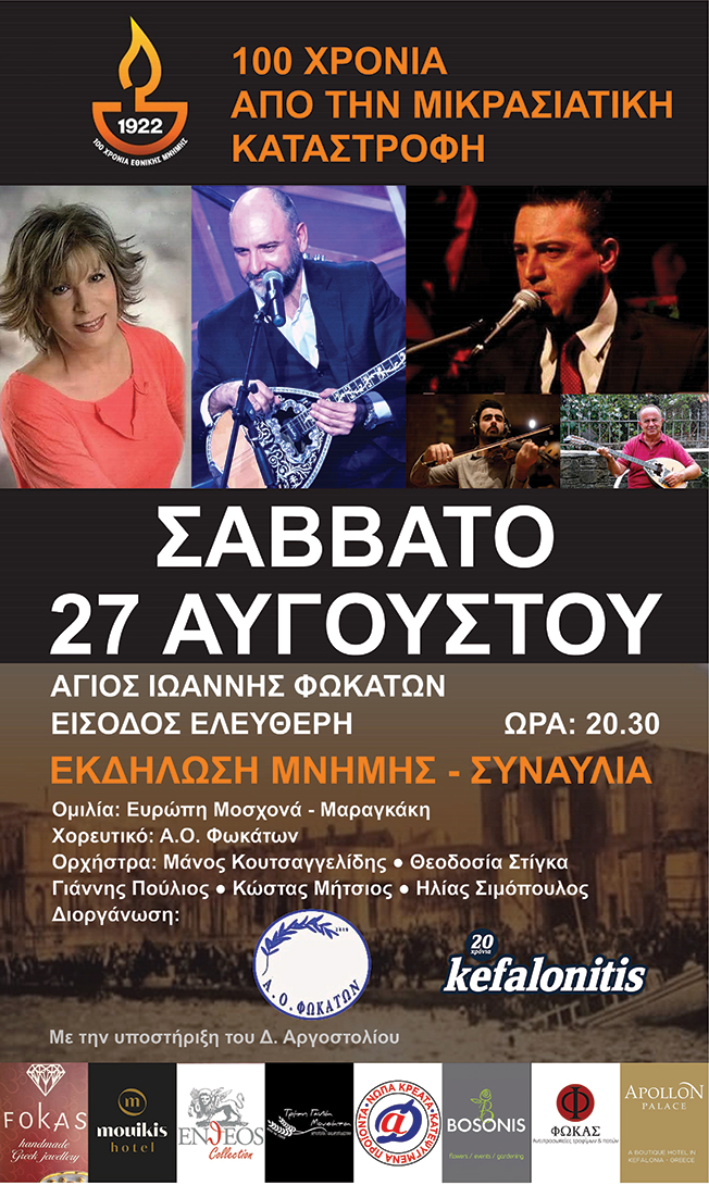 Το ΣΑΒΒΑΤΟ 27 ΑΥΓΟΥΣΤΟΥ σας προσκαλούμε στον Άγιο Ιωάννη Φωκάτων, ώρα 21.00 σε μια ΕΚΔΗΛΩΣΗ ΜΝΗΜΗΣ – ΣΥΝΑΥΛΙΑ «100 ΧΡΟΝΙΑ ΑΠΟ ΤΗΝ ΜΙΚΡΑΣΙΑΤΙΚΗ ΚΑΤΑΣΤΡΟΦΗ»