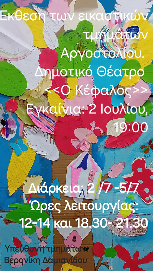 Την Τρίτη 2 Ιουλίου στην Αίθουσα Αντίοχου & Σπύρου Ευαγγελάτου του Δημοτικού Θεάτρου Αργοστολίου «Ο ΚΕΦΑΛΟΣ», θα γίνουν τα εγκαίνια της έκθεσης των μαθητών των Τμημάτων του Εικαστικού Εργαστηρίου του Δήμου Αργοστολίου, με τα έργα που δημιούργησαν όλη τη χρονιά.