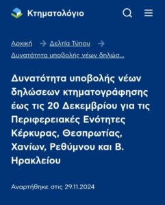 Παράταση για τις δηλώσεις κτηματογράφησης έως τις 20 Δεκεμβρίου 2024, δόθηκε στους Νομούς της Κρήτης, στη Θεσπρωτία, στην Κέρκυρα όχι όμως και στα υπόλοιπα νησιά του Ιονίου για τα οποία η προθεσμία δήλωσης δικαιωμάτων έληξε στις 30 Νοεμβρίου.