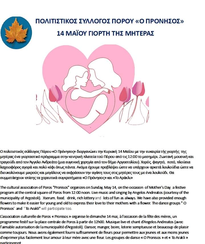 Ο πολιτιστικός σύλλογος Πόρου «Ο Πρόνησος» διοργανώνει την Κυριακή 14 Μαΐου με την ευκαιρία τής γιορτής της μητέρας ένα γιορταστικό πρόγραμμα στην κεντρική πλατεία τού Πόρου από τις 12:00 το μεσημέρι. Ζωντανή μουσική και τραγούδι από τον Άγγελο Ανδρεάτο (μια ευγενική χορηγία από τον δήμο Αργοστολίου). Χορός, φαγητό, ποτό, πλούσια