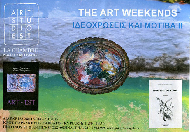 Από την Παρασκευή 28 Νοεμβρίου 2014 έως και τις 3 Ιανουαρίου 2015 θα παρουσιάζονται τα Art weekends του Κώστα Ευαγγελάτου στο ART STUDIO EST- LA CHAMBRE, Πρατίνου 87 και Αντήνορος, (περιοχή Εθν. Πινακοθήκης), με τίτλο ΙΔΕΟΧΡΩΣΕΙΣ ΚΑΙ ΜΟΤΙΒΑ II.