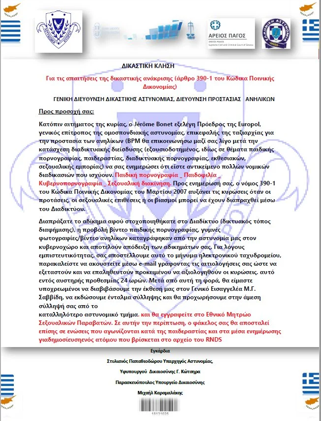 Στο πλαίσιο αυτό ανακοινώνεται ότι, το παρακάτω κείμενο – μήνυμα που διακινείται μέσω ηλεκτρονικού ταχυδρομείου (email), ως δήθεν επιστολή αξιωματούχων της Ελληνικής Αστυνομίας ή άλλων ευρωπαϊκών και διεθνών οργανισμών, με αναφορά σε υπηρεσίες της Ελληνικής Αστυνομίας («Γενική Διεύθυνση Δικαστικής Αστυνομίας», «Διεύθυνση Προστασίας Ανηλίκων») είναι καταφανώς ψευδεπίγραφο και απατηλό και αποστέλλεται από δράστες που επιχειρούν προφανώς να εξαπατήσουν – παραπλανήσουν τους πολίτες και ακολούθως να αποκομίσουν παράνομο οικονομικό όφελος.