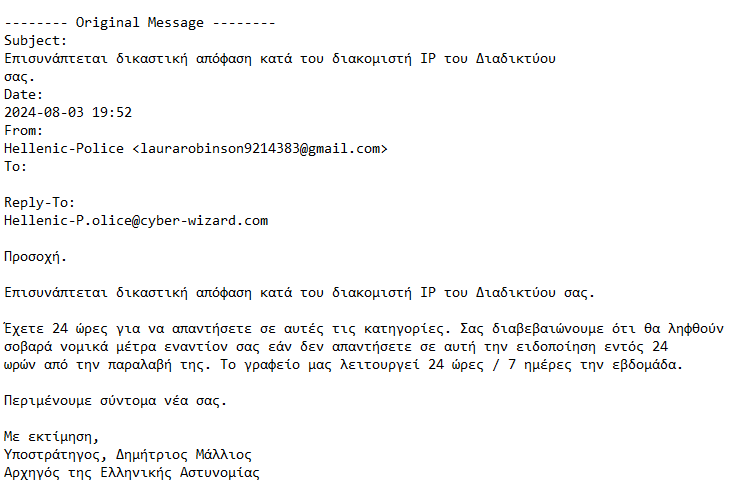 Στην προκειμένη περίπτωση, η επιστολή αποστέλλεται μέσω μηνύματος ηλεκτρονικού ταχυδρομείου (email) ως συνημμένο έγγραφο, ενώ στο σώμα του email ο αποδέκτης προτρέπεται να απαντήσει εντός 24 ωρών από την παραλαβή της ειδοποίησης. Μάλιστα, ως υπογράφων του μηνύματος εμφαίνεται ο Αρχηγός της Ελληνικής Αστυνομίας.