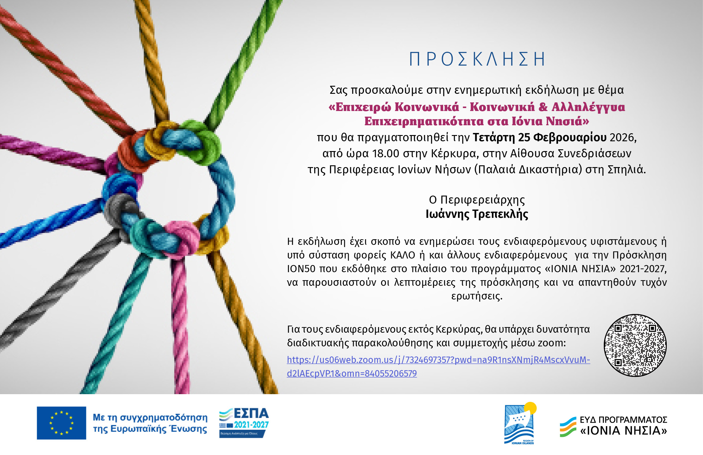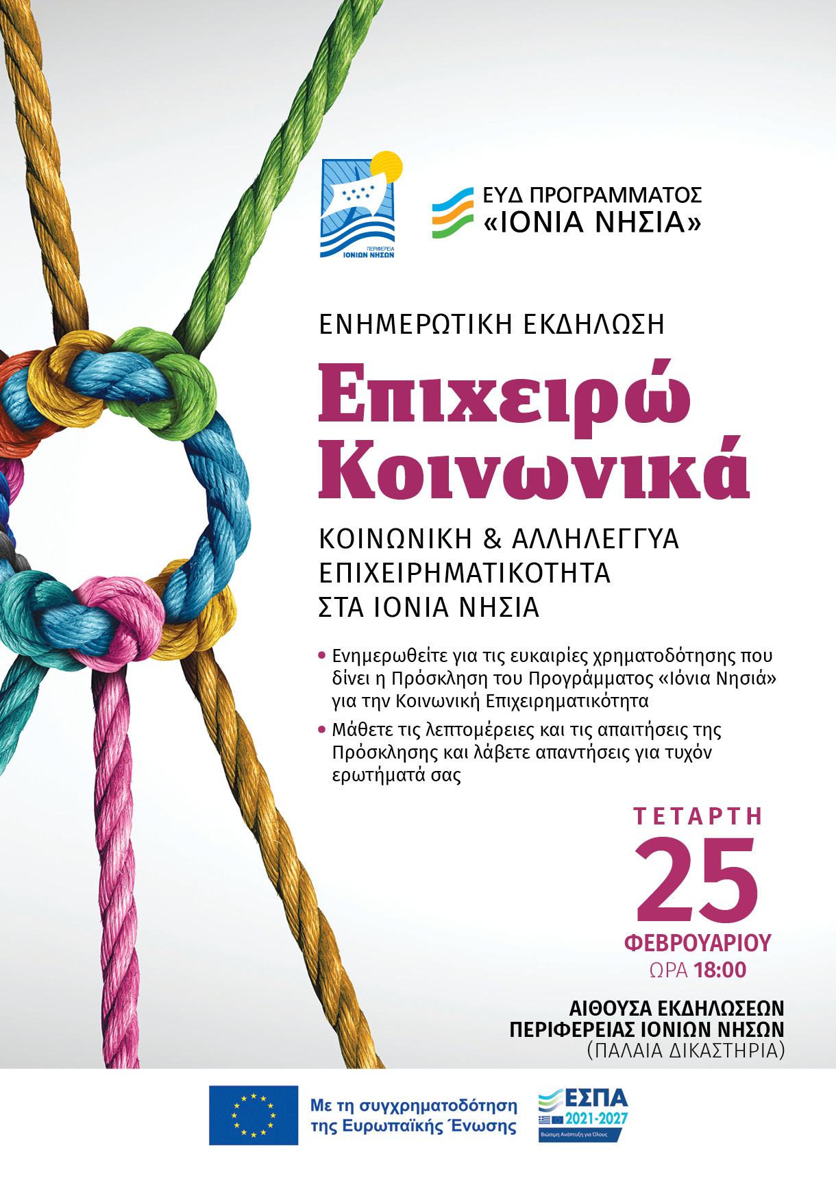 Ενημερωτική εκδήλωση με θέμα «Eπιχειρώ Κοινωνικά – Κοινωνική και Αλληλέγγυα Επιχειρηματικότητα στα Ιόνια Νησιά» θα πραγματοποιηθεί στην Κέρκυρα την Τετάρτη 25 Φεβρουαρίου 2026 από 18:00.00μ.μ. στην Αίθουσα Συνεδριάσεων της Περιφέρειας Ιονίων Νήσων (Παλαιά Δικαστήρια).