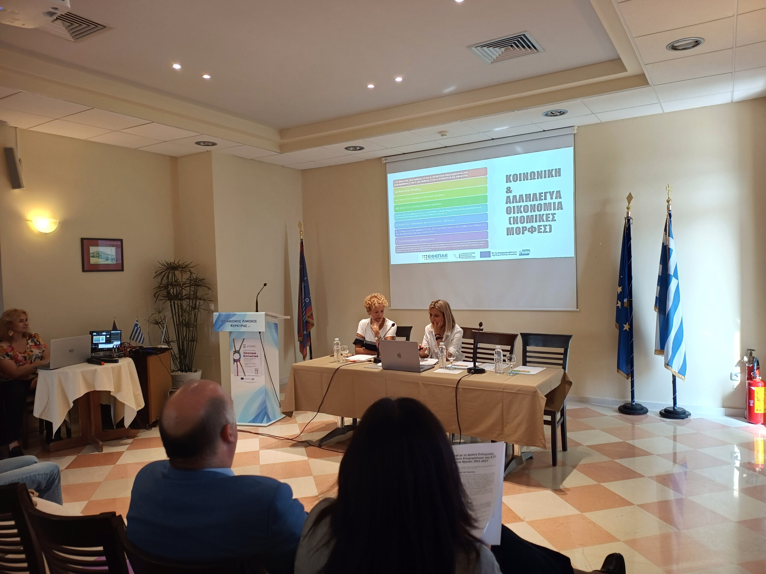 Η κ. Ελένη Κοντονάσιου Διευθύντρια Κοινωνικής και Αλληλέγγυας Οικονομίας του Υπουργείου Κοινωνικής Συνοχής και Οικογένειας παρουσίασε  θεσμικό πλαίσιο της Κοινωνικής και Αλληλέγγυας Επιχειρηματικότητας ενώ έκανε αναφορά σε συγκεκριμένα παραδείγματα ανά την Ελλάδα ενώ η κ Μαρία Αγγελοπούλου, στέλεχος του ΕΦΕΠΑΕ (Ενδιάμεσου Φορέα) αναφέρθηκε πιο συγκεκριμένα στο πλαίσιο προετοιμασίας και υλοποίησης μια πρότασης χρηματοδότησης ΚΑΛΟ.