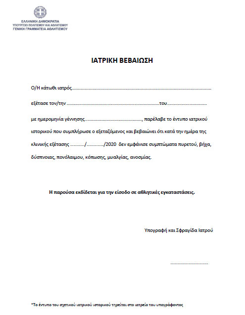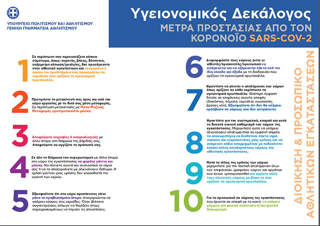Υγειονομικά πρωτόκολλα που πρέπει να τηρούνται και άλλες οδηγίες, θα βρείτε στα site της Γενικής Γραμματείας Αθλητισμού https://gga.gov.gr/ και του ΣΕΓΑΣ www.segas.gr