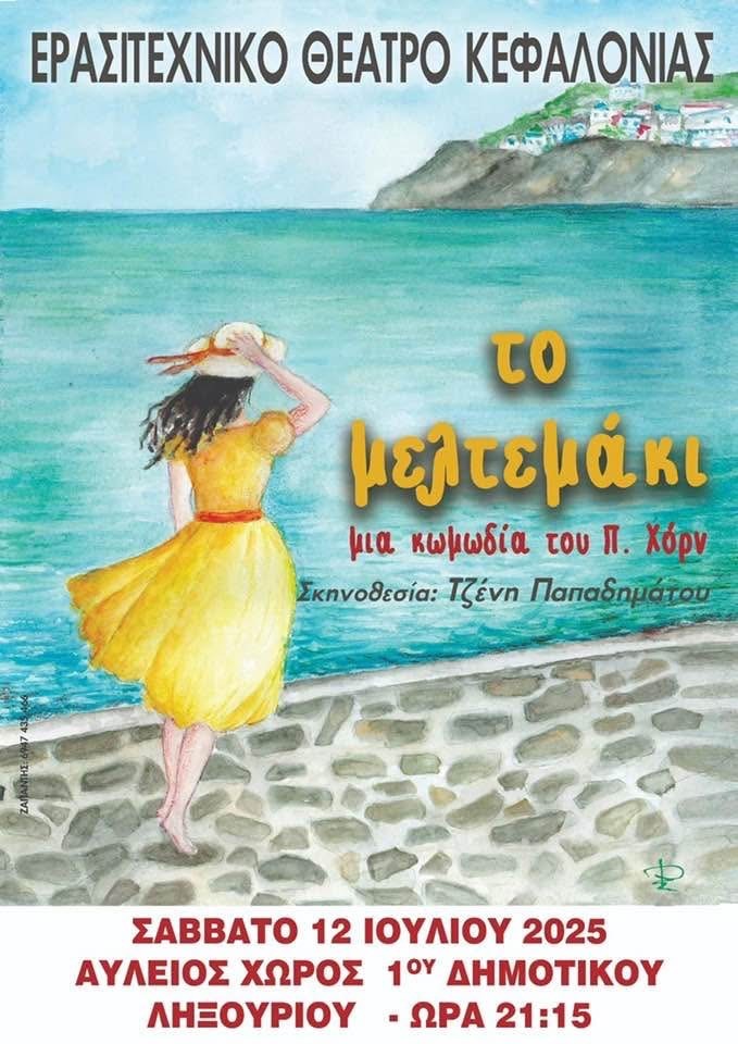 Με ιδιαίτερη χαρά και με την υποστήριξη του Δήμου Ληξουρίου, παρουσιάζουμε την πετυχημένη παράσταση μας ´ Το μελτεμάκι ´ , του Παντελή Χορν, στον αύλειο χώρο του 1ου Δημοτικού σχολείου Ληξουρίου, το Σάββατο 1Ιουλίου 2025 στις 9:15 μμ.