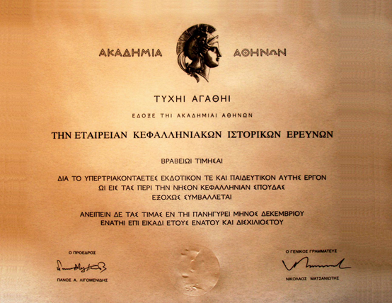 Παρακάτω θα παραθέσω κατάλογο των εκδόσεων της Εταιρείας Κεφαλληνιακών Ιστορικών Ερευνών από τη σειρά «Μελέτες και Διατριβές», αφού πρώτα αναφέρω το σημαντικό γεγονός της βράβευσης της Εταιρείας από το ανώτατο πνευματικό ίδρυμα της χώρας, την Ακαδημία Αθηνών, «για το εκδοτικό και παιδευτικό έργο της». Το βραβείο παρέλαβε από τον Γεν. Γραμματέα της Ακαδημίας καθηγητή Νικόλαο Ματσανιώτη ο Πρόεδρος της Εταιρείας καθηγητής Γεώργιος Ν. Μοσχόπουλος στην επίσημη ετήσια συνεδρία της Ακαδημίας, στις 19 Δεκεμβρίου 2009.[6]