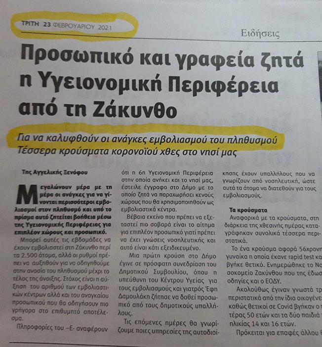 Σύμφωνα με το κατωτέρω δημοσίευμα της εφημερίδας ¨Ερμής” (23/2), η 6η Υγειονομική Περιφέρεια ζητάει Δημοτικούς (!) υπαλλήλους με γνώσεις νοσηλευτικής, ώστε αυτοί οι υπάλληλοι να διατεθούν για τους εμβολιασμούς.