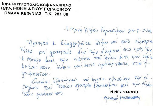 Η προσπάθεια αυτή μου έδωσε μεγάλη πνευματική συγκίνηση όταν μια από τις ζωγραφικές προσεγγίσεις μου έγινε δεκτή στο Αρχονταρίκι της Ιεράς Μονής του στα Ομαλά των Βαλσαμάτων της Κεφαλονιάς.