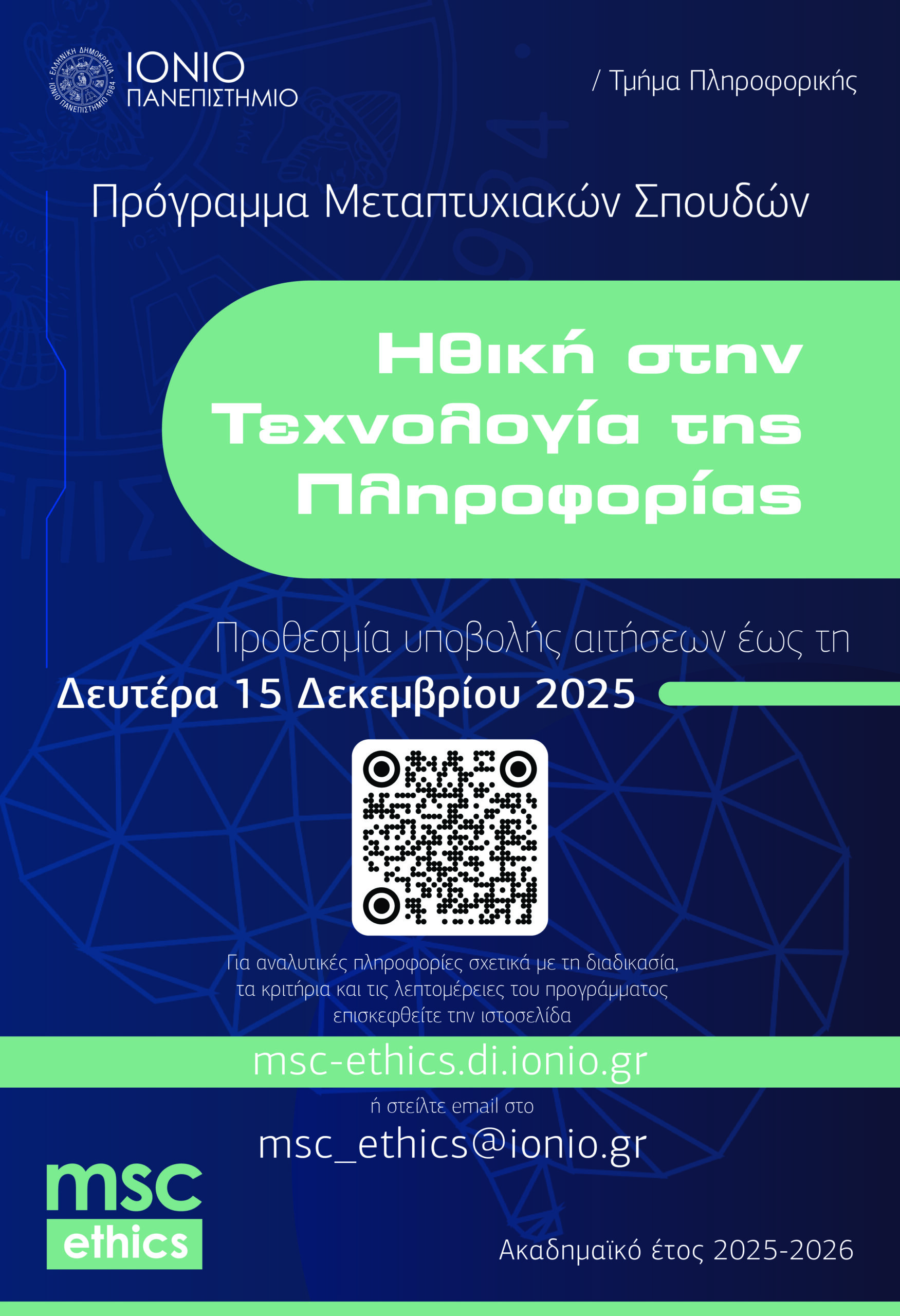 Η υποβολή αιτήσεων είναι ανοιχτή μέχρι την 15η Δεκεμβρίου 2025. Επισκεφθείτε την ιστοσελίδα μας (msc-ethics.di.ionio.gr) για περισσότερες πληροφορίες ή επικοινωνήστε μέσω email: