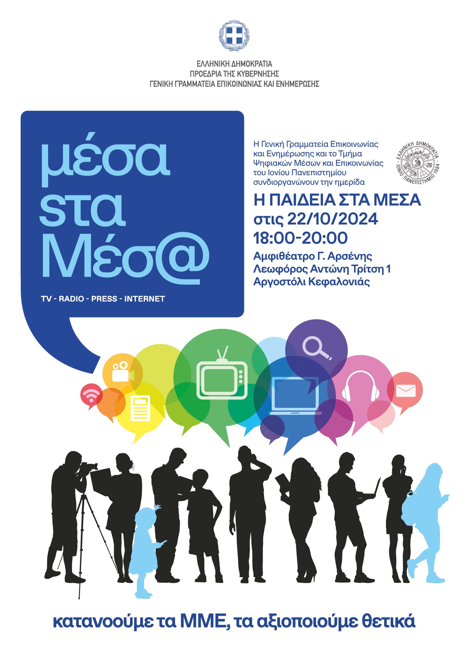 Η Γενική Γραμματεία Επικοινωνίας και Ενημέρωσης της Προεδρίας της Κυβέρνησης και το Τμήμα Ψηφιακών Μέσων και Επικοινωνίας του Ιονίου Πανεπιστημίου, διοργανώνουν ημερίδα με θέμα «Παιδεία στα Μέσα», την Τρίτη, 22 Οκτωβρίου 2024, από τις 18:00 έως τις 20:00, στο Αμφιθέατρο «Γεράσιμος Αρσένης» στο Αργοστόλι Κεφαλονιάς (Λ. Αντώνη Τρίτση 1).