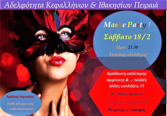 Η Αδελφότητα Κεφαλλήνων & Ιθακησίων Πειραιά σε συνεργασία με το τμήμα νεολαίας της & με τη συμμετοχή των τμημάτων νεολαίας των συλλόγων Απανταχού Δηλινάδων, Πυργιού & Φαρσινών ετοιμάζει το Σάββατο 18 Φεβρουαρίου 2017, από τις 9.30 μ.μ. , στο Πολιτιστικό της Κέντρο στον Πειραιά (Γρ. Λαμπράκη 144, 1ος όροφος) μια φαντασμαγορική βραδιά για Μικρούς & Μεγάλους γεμάτη Χορό , Μπρίο, άφθονη Ρομπόλα & Μεταμφιέσεις που θα συζητηθούν και … θα βραβευτούν !!!