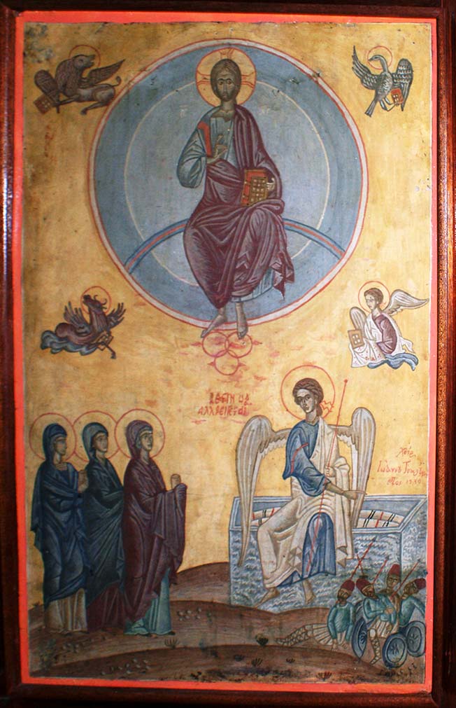 Στο κάτω μέρος δεξιά πάνω στο μνημείο κάθεται ο άγγελος με ανοιγμένα τα φτερά, που δείχνει τον άδειο τάφο στις τρεις γυναίκες, που πήγαν να μυρώσουν το σώμα του Χριστού. Σύμφωνα με τα πατροπαράδοτα έθιμα μια ομάδα γυναικών το πρωί της επομένης της ταφής του Χριστού κατευθύνεται στον τάφο προκειμένου να μυρώσουν το σώμα του (Ματθ.28.1, Μάρκ.16.1-2, Λουκάς 24:1 και Ιωάννης 20:1α.)