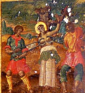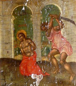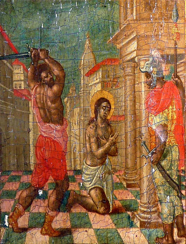 Σχολιάζοντας αναλυτικά την κάθε μικρογραφία από αριστερά της μορφής της Αγίας Σοφίας, εικονίζεται στο πάνω μέρος: «Η απότμησις της κεφαλής της Αγίας Ελπίδος». Από κάτω ακριβώς, σε κάθετη στοίχιση είναι η μικρογραφία που εικονίζει το θέμα: «Η απότμησις της κεφαλής της Αγίας Πίστεως» και η επόμενη από κάτω είναι η μικρογραφία που εικονίζει το θέμα: «Η απότμησις της κεφαλής της Αγίας Αγάπης».