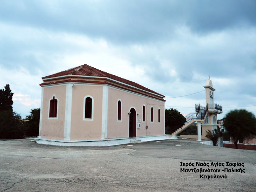 Ο Ιερός Ναός της; Αγίας Σοφίας στα Μαντζαβινάτα ήταν και είναι συναδερφικός διαφόρων οικογενειών του χωριού. Έχει εντοπιστεί η χρονολογία,1693, σε νοταριακή πράξη που αφορά στο ναό και η οποία συντάχθηκε από τον νοτάριο Μηνιάτη Κωνσταντίνο. Ο ναός καταστράφηκε κατά καιρούς από σεισμούς, ιδίως από το σεισμό του ’53 και ανοικοδομήθηκε στην ίδια θέση με αντισεισμική κατασκευή.