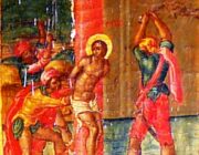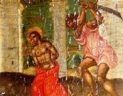 Σχολιάζοντας αναλυτικά την κάθε μικρογραφία από αριστερά της μορφής της Αγίας Σοφίας, εικονίζεται στο πάνω μέρος: «Η απότμησις της κεφαλής της Αγίας Ελπίδος». Από κάτω ακριβώς, σε κάθετη στοίχιση είναι η μικρογραφία που εικονίζει το θέμα: «Η απότμησις της κεφαλής της Αγίας Πίστεως» και η επόμενη από κάτω είναι η μικρογραφία που εικονίζει το θέμα: «Η απότμησις της κεφαλής της Αγίας Αγάπης».