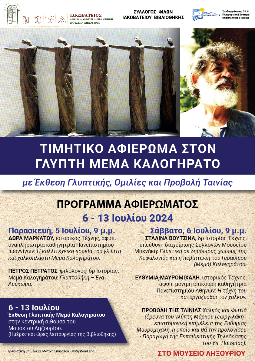 Πέρυσι η Ιακωβάτειος Βιβλιοθήκη τίμησε δύο εξαίρετους συμπολίτες με σημαντική προσφορά στο χώρο της επιστήμης τους, την ιστορικό Τέχνης Δώρα Μαρκάτου, αφυπ. αναπληρώτρια καθηγήτρια Πανεπιστημίου Ιωαννίνων, και τον αρχαιολόγο Βασίλη Αραβαντινό, επίτιμο έφορο Αρχαιοτήτων Βοιωτίας. Φέτος αποφασίσαμε να τιμήσουμε έναν αξιόλογο συμπολίτη μας, τον γλύπτη Μεμά Καλογηράτο.