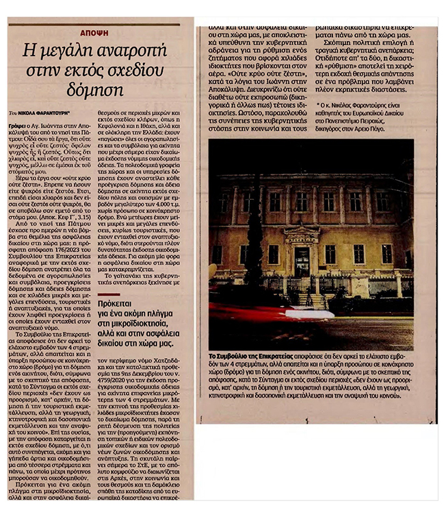 Από το νησί της Πάτμου έσκασε προ ημέρων η νέα βόμβα στα θεμέλια της ασφάλειας δικαίου στη χώρα μας: Η πρόσφατη απόφαση 176/2023 του Συμβουλίου της Επικρατείας αναφορικά με την εκτός σχεδίου δόμηση ανατρέπει όλα τα δεδομένα σε αγοραπωλησίες και συμβόλαια, προεγκρίσεις δόμησης και άδειες δόμησης και σε χιλιάδες μικρές και μεγάλες επενδύσεις, τουριστικές ή αναπτυξιακές, για τις οποίες έχουν ληφθεί προεγκρίσεις ή οι οποίες έχουν ενταχθεί στον Αναπτυξιακό νόμο.