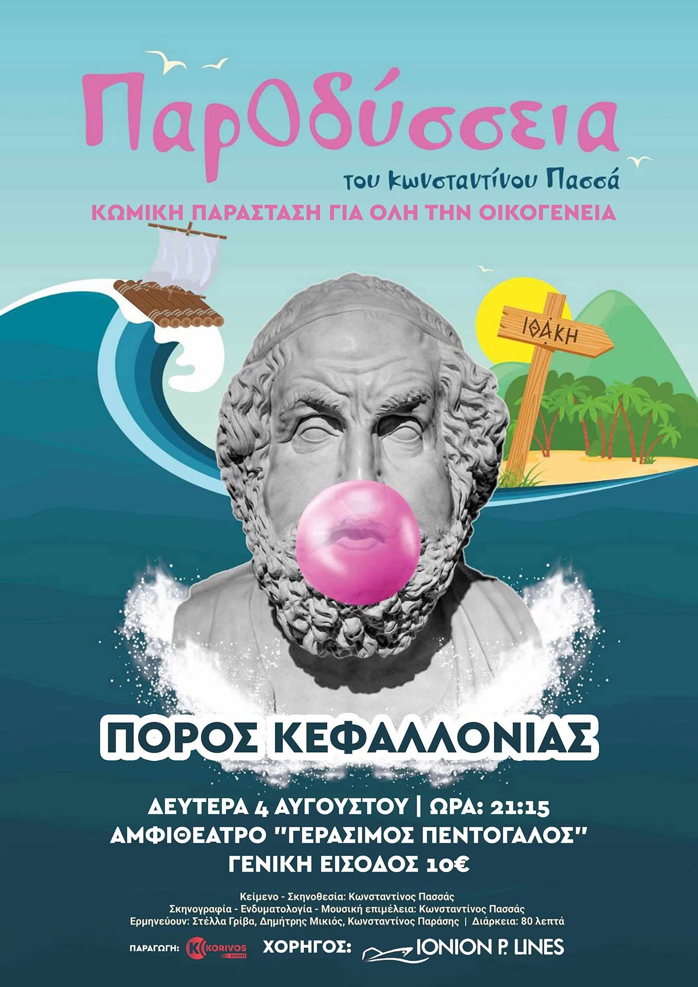 Η μεγάλη κωμική παράσταση για όλη την οικογένεια “ΠαρΟδύσσεια” του Κωνσταντίνου Πασσά σας καλεί στο Αμφιθέατρο “Γεράσιμος Πεντόγαλος” του Πόρου Κεφαλονιάς τη Δευτέρα 4 Αυγούστου στις 21:15 για 80 λεπτά πρωτότυπης διασκέδασης!