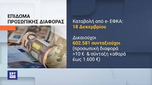 Χθες, Τετάρτη, 18 Δεκεμβρίου 2024 έγινε σε συγκεκριμένες κατηγορίες συνταξιούχων γήρατος, χηρείας, κ.α. (συνολικός αριθμός για φέτος 602.581) η καταβολή του “πολυδιαφημισμένου” επιδόματος προσωπικής διαφοράς, ύψους από 100 ευρώ έως 200 ευρώ.