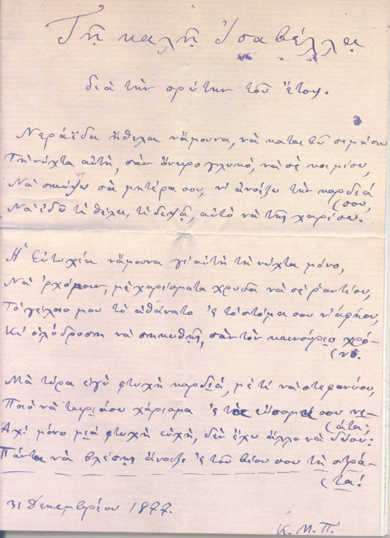 Βρισκόμαστε στο καλοκαίρι του 1876 όπου ο νεαρός Παλαμάς γράφει στην σχεδόν συνομηλική του Ισαβέλλα, επιστολές µε εξομολογητικό χαρακτήρα για τον µεγάλο έρωτά του για εκείνη καθώς και ποιήματα µε ακροστιχίδα° το όνοµα της!