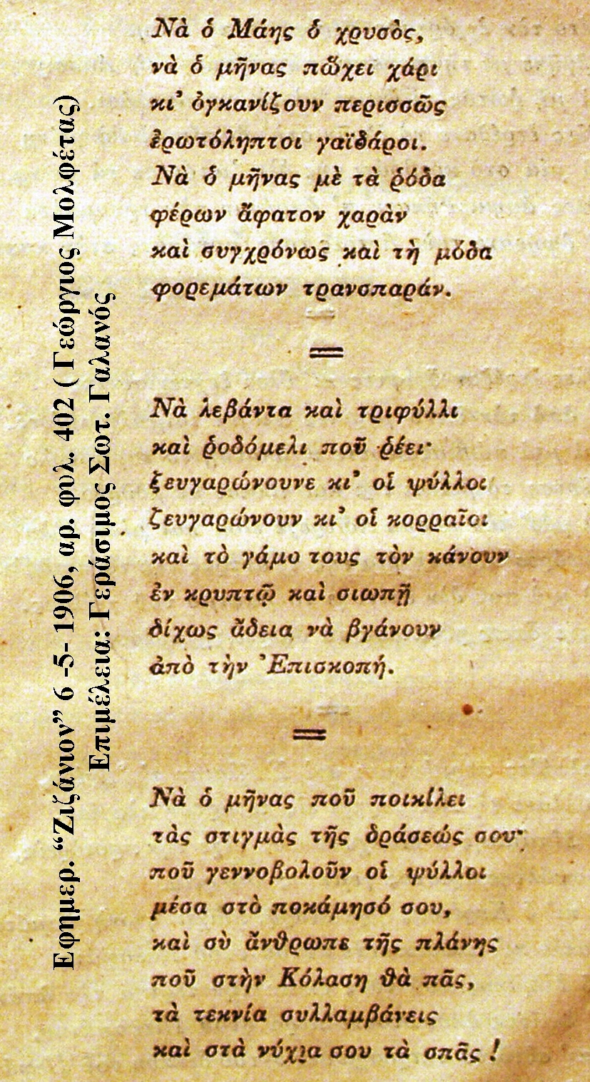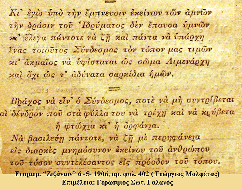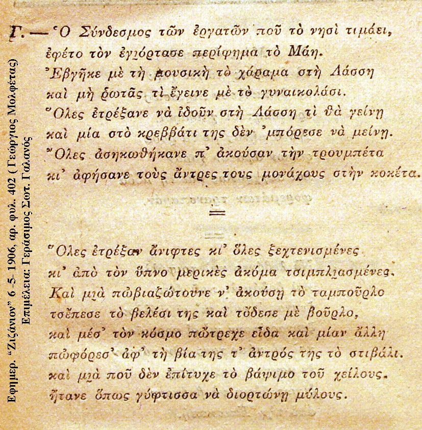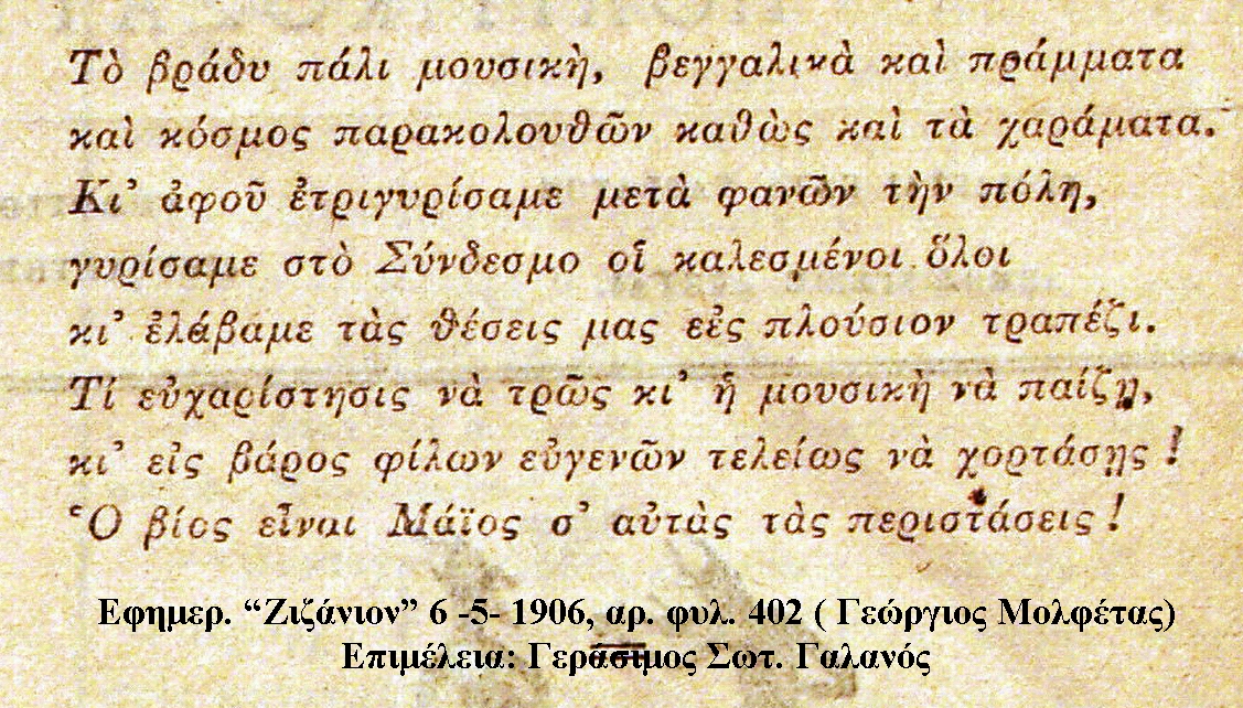 Ο Γεώργιος Μολφέτας περιγράφει στην εφημερίδα του το «Ζιζάνιον» , 1-5-1906, πολύ όμορφα, με πικάντικο ποιητικό τρόπο όλες αυτές τις εορταστικές εικόνες της Εργατικής Πρωτομαγιάς του Συνδέσμου, αναφέροντας τη δράση των μελών που βοήθησαν και πρόσφεραν τα εκλεκτά φαγώσιμα, για να γίνει αυτή η μοναδική εορτή. Στέκεται σε εικόνες λαογραφικές και στην προσφορά των μελών του Συνδέσμου, για ότι ο καθένας συνέδραμε στο γιορτάσι και επιπλέον σχολιάζει και «ποστιάζει» την κάθε στιγμή που του προκάλεσε κέφι, αλλά και θέμα για την ποιητική γραφή του. Επίσης, ο Μολφέτας αναφέρεται ποιητικά στο ότι τα μέλη του Εργατικού Συνδέσμου, δεν έμειναν μόνο στη γιορτή της Πρωτομαγιάς στη Λάση, αλλά μετέφεραν τη συνέχειά της και στο Αργοστόλι που διασκέδασαν έως το πρωί τρώγοντας και πίνοντας με πολύ κέφι!