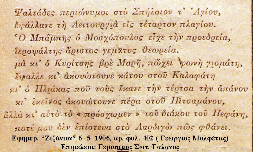 Ετούτο το πρωτομαγιάτικο γιορτάσι έγινε κοντά στο σπήλαιο του Αγίου Γερασίμου στα Σπήλια, με πρώτη τη Θεία Λειτουργιά για το καλό του μήνα κι έπειτα, εκεί κοντά… και η ορχήστρα να παίζει τα άσματα, τα κανταδόρικα, αλλά και τους ευρωπαϊκούς χορούς , που τους περίμεναν τα κρυφά, τα ερωτευμένα ζευγαράκια για να αγκαλιαστούν για τση τύχης τους το καλό.
