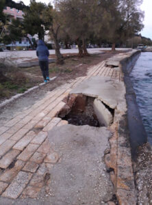 Στην παραλιακή διαδρομή, από την πλαζ προς το Κρυονέρι, όπως εύκολα μπορεί κανείς να διαπιστώσει και όπως φαίνεται στις επισυναπτόμενες φωτογραφίες, υπάρχει εκτεταμένη αποδιάρθρωση και καταστροφή της παραλιακής ζώνης που χρησιμοποιείται και για τον περίπατο Ζακυνθίων και επισκεπτών.