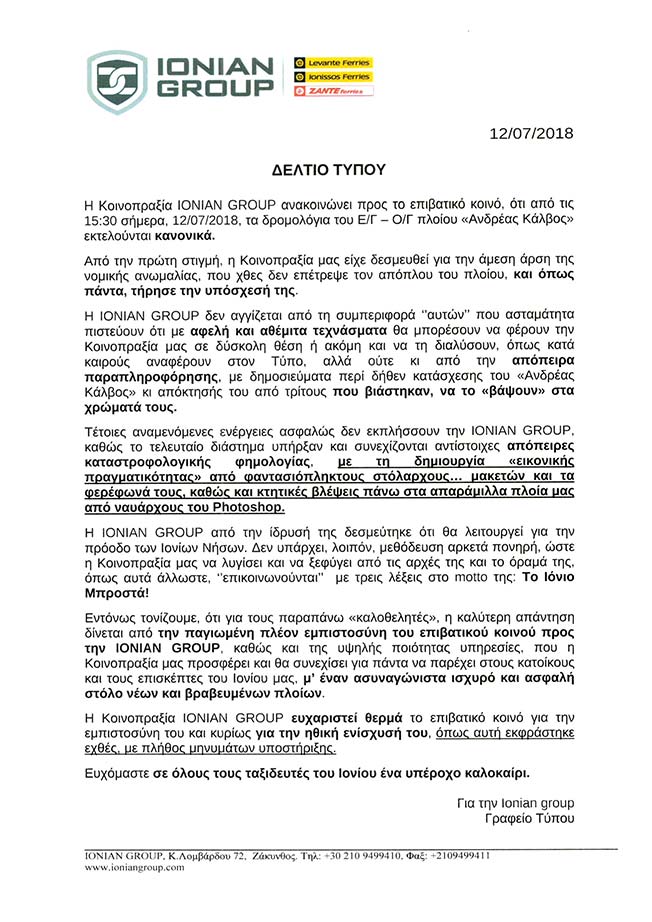 Κανονικά τα δρομολόγια του “Ανδρέας Κάλβος”.