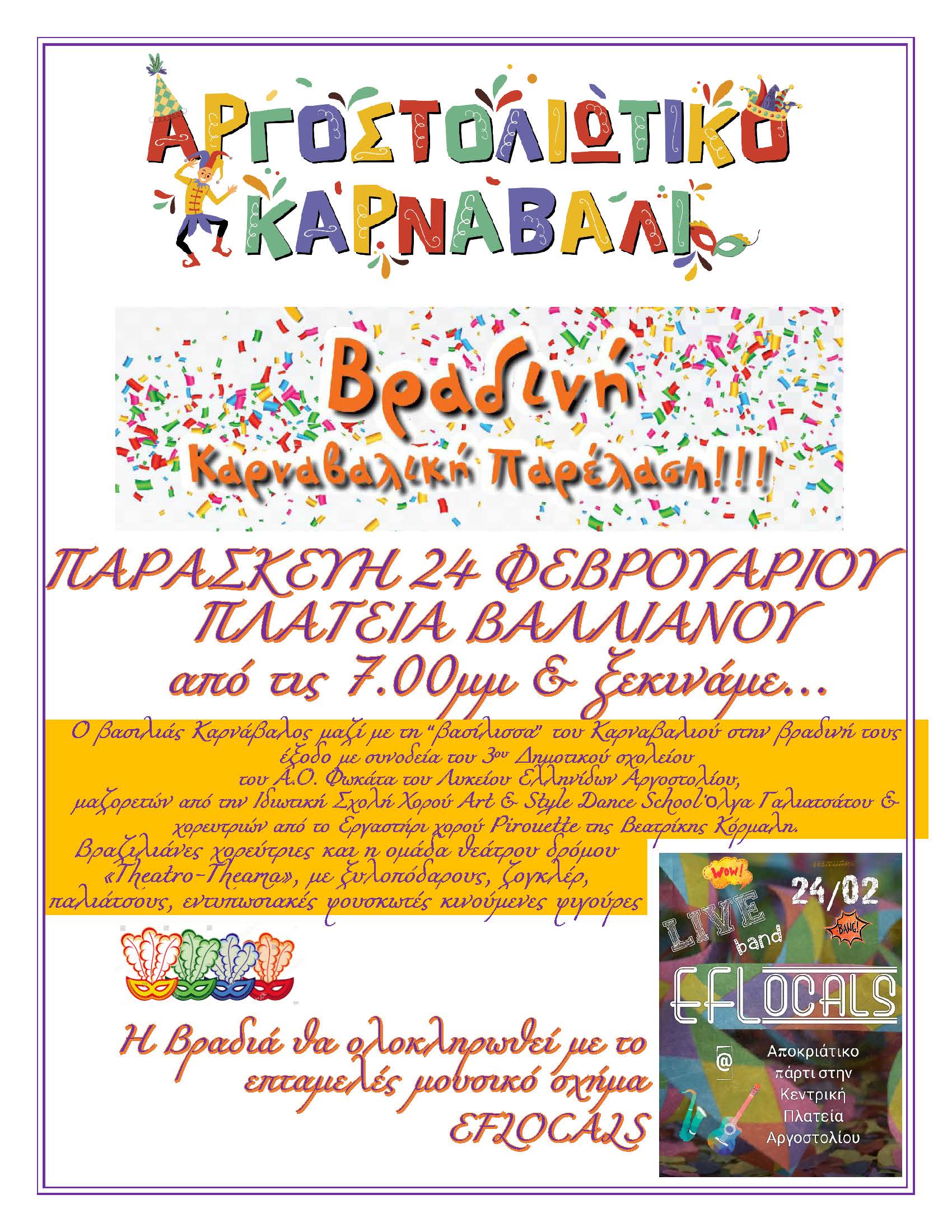 Την Παρασκευή 24 Φεβρουαρίου θα γίνει η Βραδινή Καρναβαλική Παρέλαση στο Αργοστόλι. Συγκεντρωνόμαστε & Ξεκινάμε από την πλατεία Βαλλιάνου στις 7:00μμ