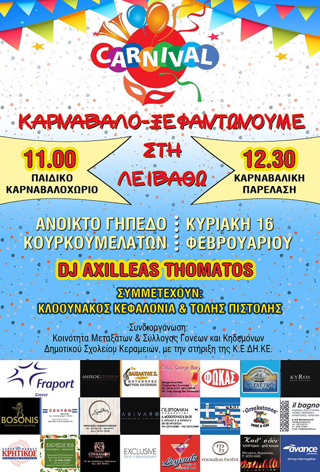 Έφτασε η ώρα το Καρναβάλι στη Λειβαθώ να ανοίξει και πάλι τα φτερά του. Την Κυριακή 16 Φεβρουαρίου, η κοινότητα Μεταξάτων σε συνεργασία με τον σύλλογο γονέων και Κηδεμόνων του δημοτικού σχολείου Κεραμειών διοργανώνουν μια γιορτή αναγέννησης με πρωταγωνιστές τα παιδιά μας. Στο Καρναβαλοχωριό που θα είναι ανοικτό από τις 11.00 στο στάδιο Κουρκουμελάτων θα βρείτε χειροτεχνίες, μουσική, χορό, σπάσιμο πινιάτων, επίσης, show από τον OSCAR, παιχνίδια με τον κλοουνάκο και τον Τόλη – Πιστόλη, αλλά και πολλές εκπλήξεις. Κατά την διάρκεια της εκδήλωσης θα προσφερθούν χυμοί και γλυκά στα παιδιά, καθώς και καφές στους γονείς.
