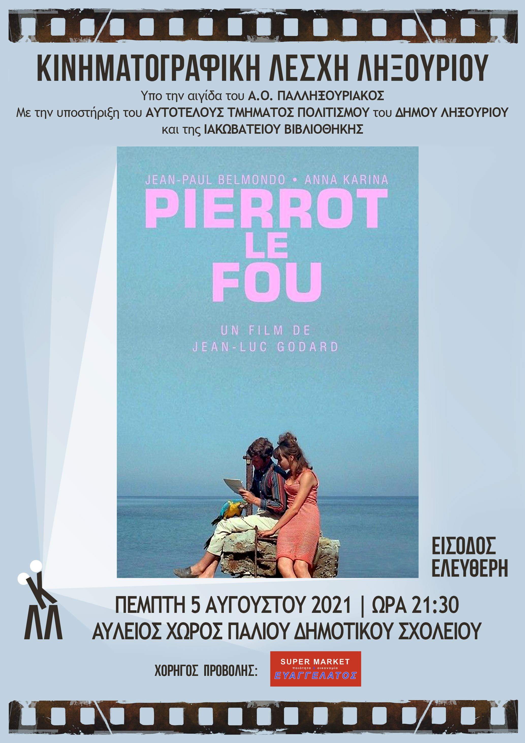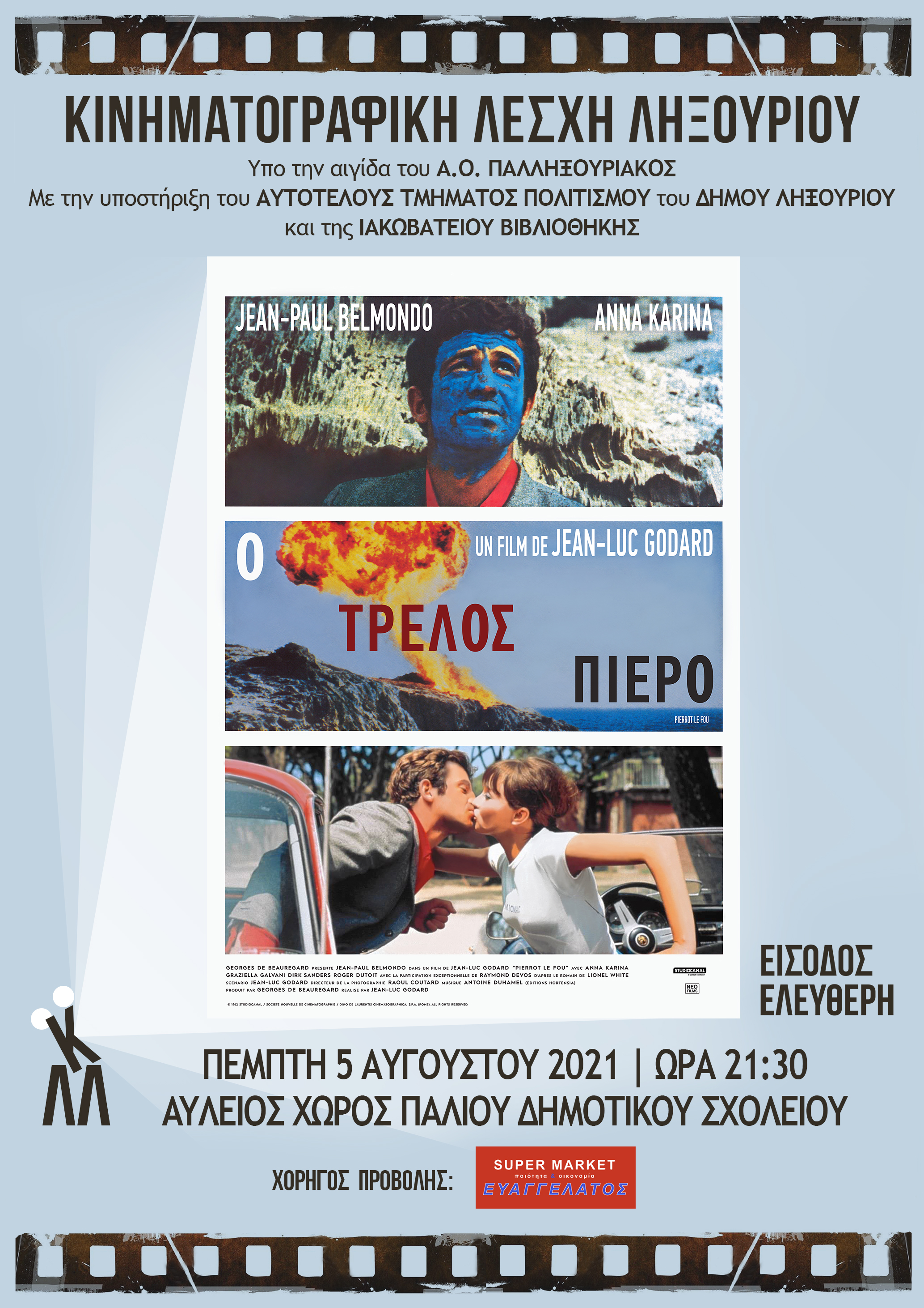 🎞 Η Κινηματογραφική Λέσχη Ληξουρίου την Πέμπτη 5/8 θα προβάλει την ταινία ορόσημο για την νουβέλ βαγκ “Ο Τρελός Πιερό” (Pierrot Le Fou, 1965) του σπουδαίου Ζαν-Λικ Γκοντάρ σε επανέκδοση με αποκατεστημένη ποιότητα εικόνας.