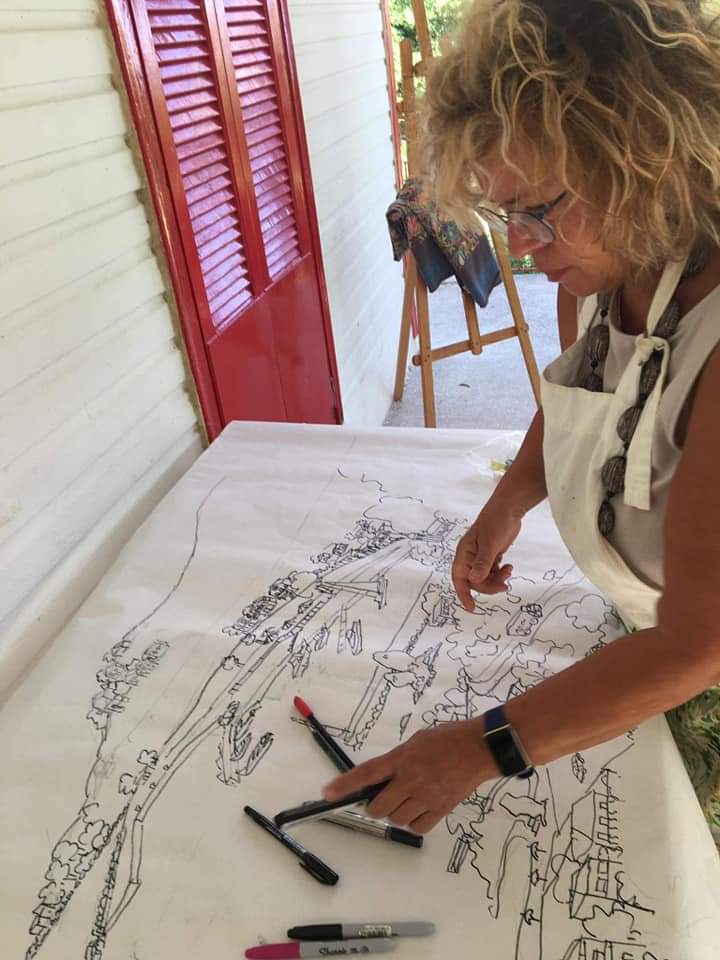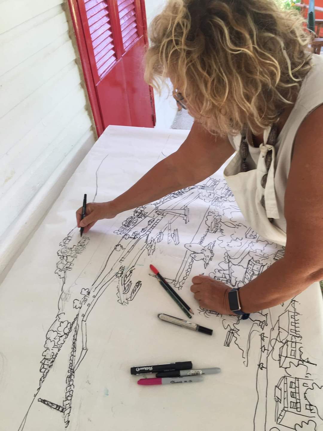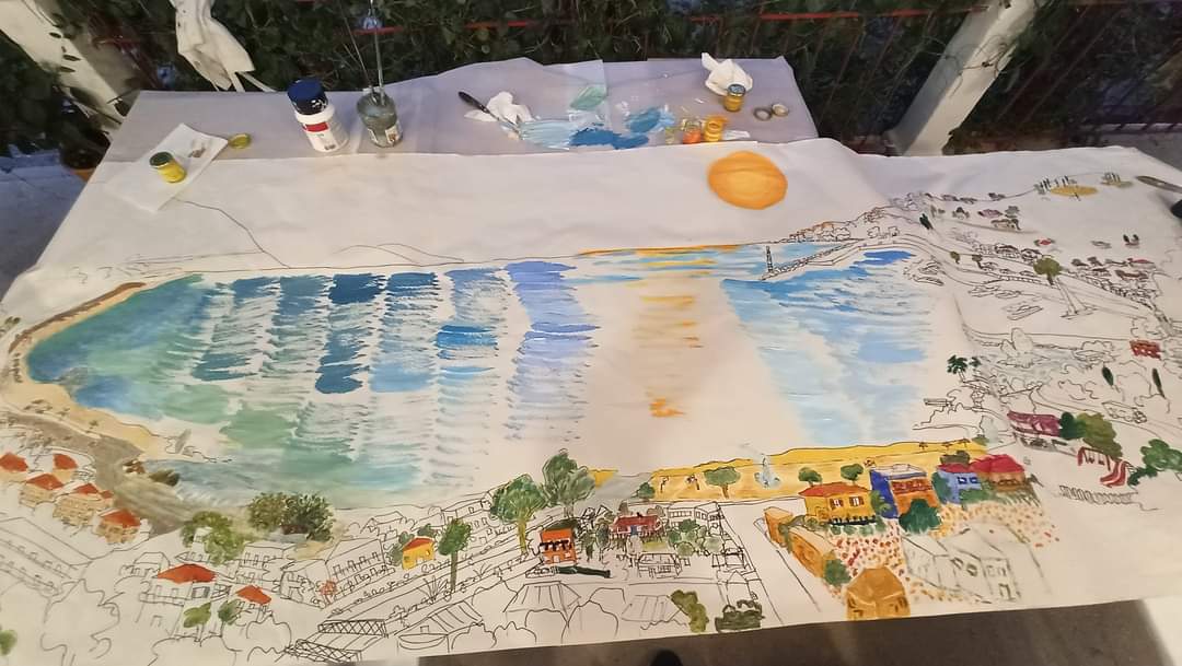 Όμως αυτή την φορά, ήταν κάτι θετικά διαφορετικό από τις δυο προηγούμενες παρουσιάσεις των μαθητών (workshops) καθώς η Νατάσα Μεταξά προσκάλεσε το ερασιτεχνικό κοινό να συμμετάσχει δημιουργικά βάζοντας πινελιές στο σχεδιάγραμμα έργου της το οποίο απεικονίζει τον πολυαγαπημένο Πόρο της από ψηλά!
