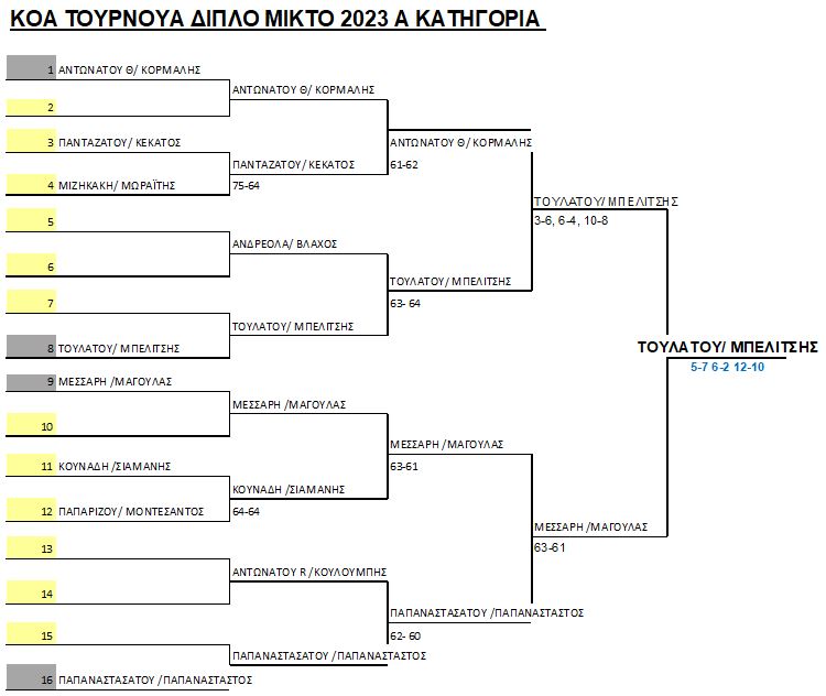 Μεγάλοι νικητές της Α’ κατηγορίας αναδείχθηκαν οι Άντζυ Τουλάτου και Γεράσιμος Μπελίτσης οι οποίοι επικράτησαν σε ένα συναρπαστικό τελικό των Αμάντα Μεσσάρη και Σπύρου Μαγουλά με 12-10 στο tie break.